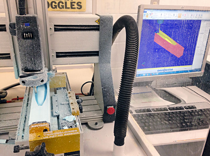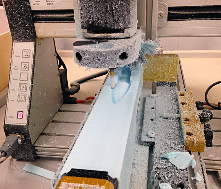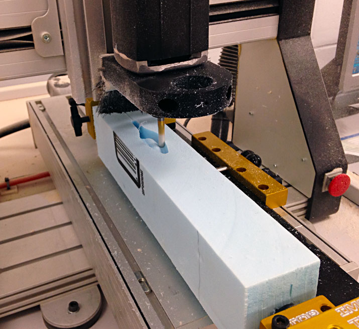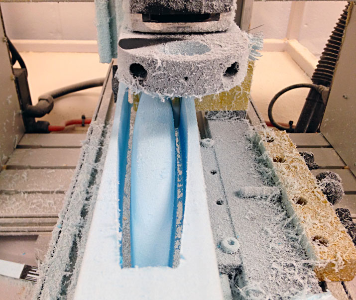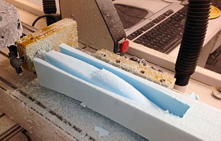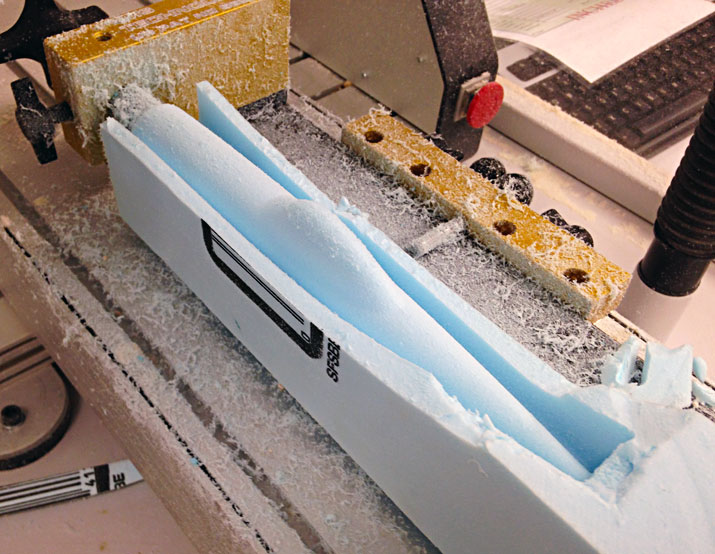 16. Fuselage toolpaths. Create toolpaths to cut fuselage from Dow’s Scoreboard EPS Polystyrene: 1) Top cut using Surface High Speed Hybrid toolpath. 2) Copy and paste Top Cut toolpath to create Bottom Cut toolpath and then change toolplane. Uses CO2 car fixture to hold foam in mill. Units all inches. |