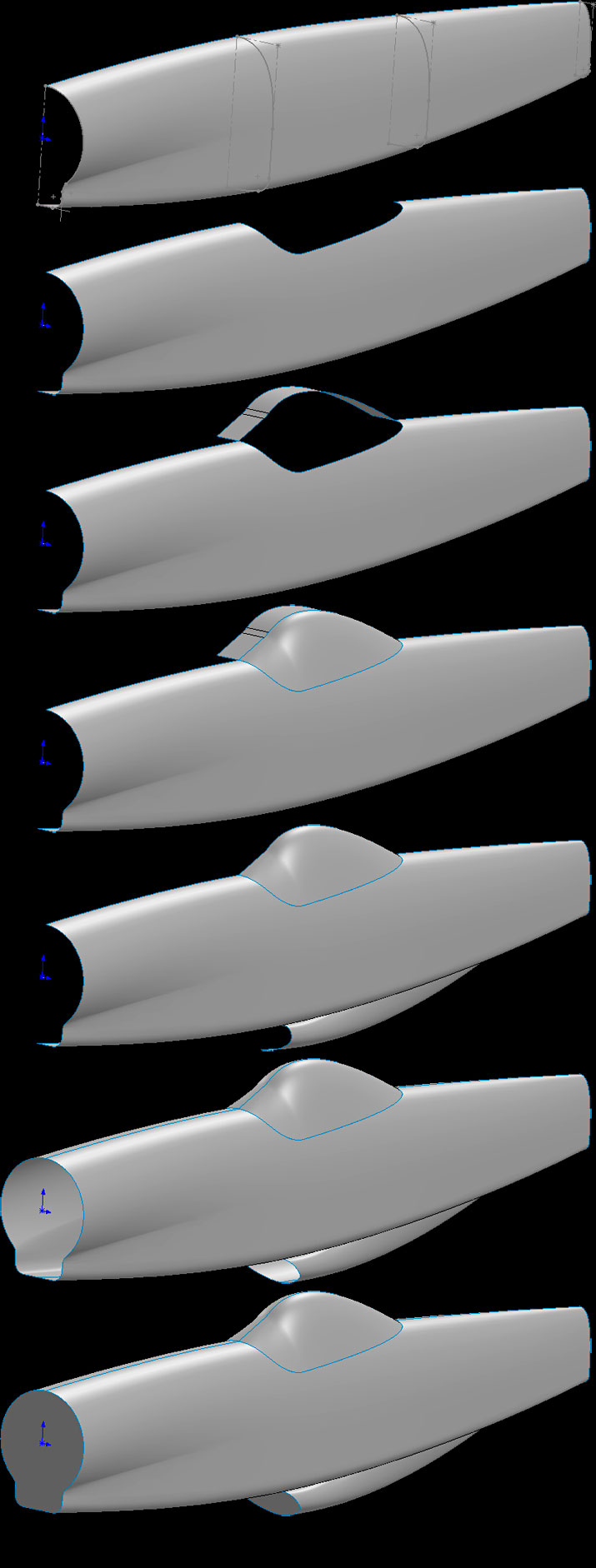 1. Fuselage. All surfaces. Loft surface using four sketches. Boundary surface for cockpit and loft surface for air intake. Units all inches. |